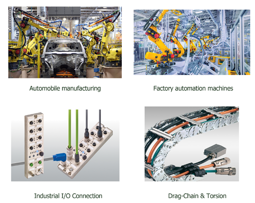 Cable type variations for drag chain and torsion applications; such as factory automation machines and automobile manufacturing.